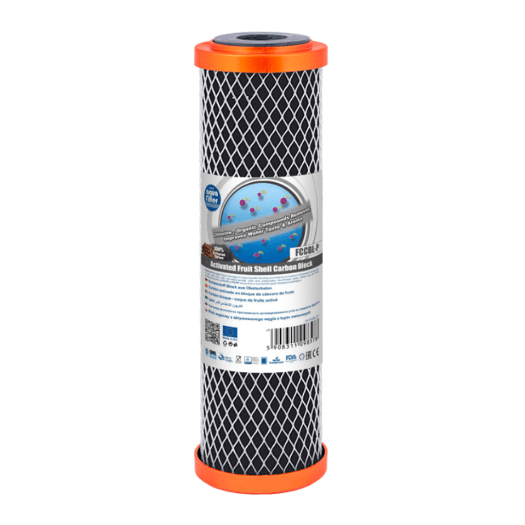 Aquafilter FCCBL-P 10" Activated Fruit Shell Carbon block cartridge. Aquafilter FCCBL-P cartridge suitable for POU (Point of Use) and POE (Points of Entry) installations. Through its block activated carbon media, FCCBL-P cartridges improve the bad taste and odour of your drinking water. By reducing the concentration of chlorine and organic compounds (VOC’s), FCCBL-P series enhances the continuous supply of fresh and clean drinking water.