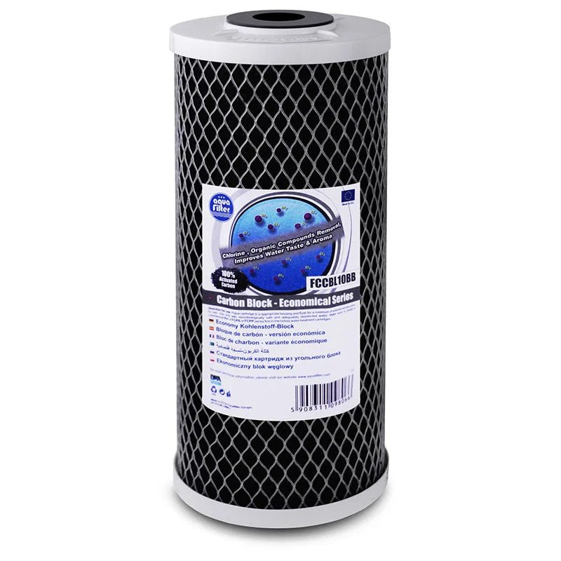 Aquafilter FCCBL10BB 10" Big Blue Carbon block cartridge. Aquafilter FCCBL10BB cartridge suitable for POU (Point of Use) and POE (Points of Entry) installations. Through its block activated carbon media, FCCBL10BB cartridges improve the bad taste and odour of your drinking water. By reducing the concentration of chlorine and organic compounds (VOC’s), FCCBL10BB series enhances the continuous supply of fresh and clean drinking water.
