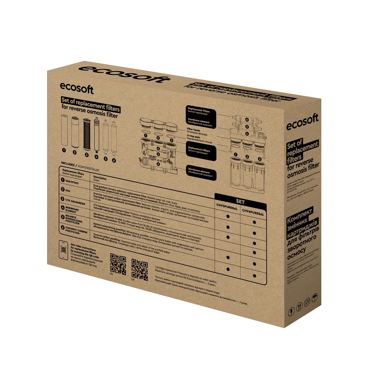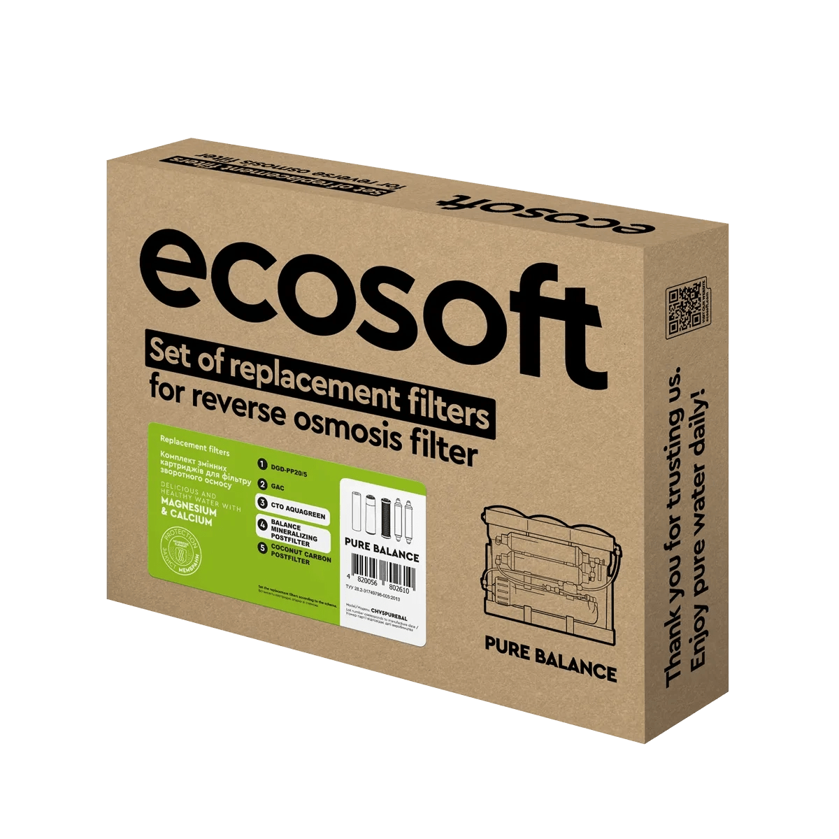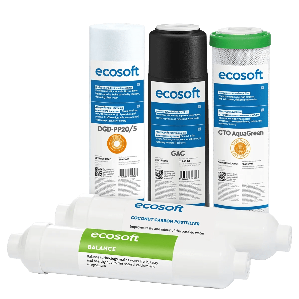 Ecosoft PURE Balance set of 5 replacement filters are designed to provide you with clean and safe drinking water. These filters are compatible with Ecosoft Pure Balance Reverse Osmosis systems and are easy to install.