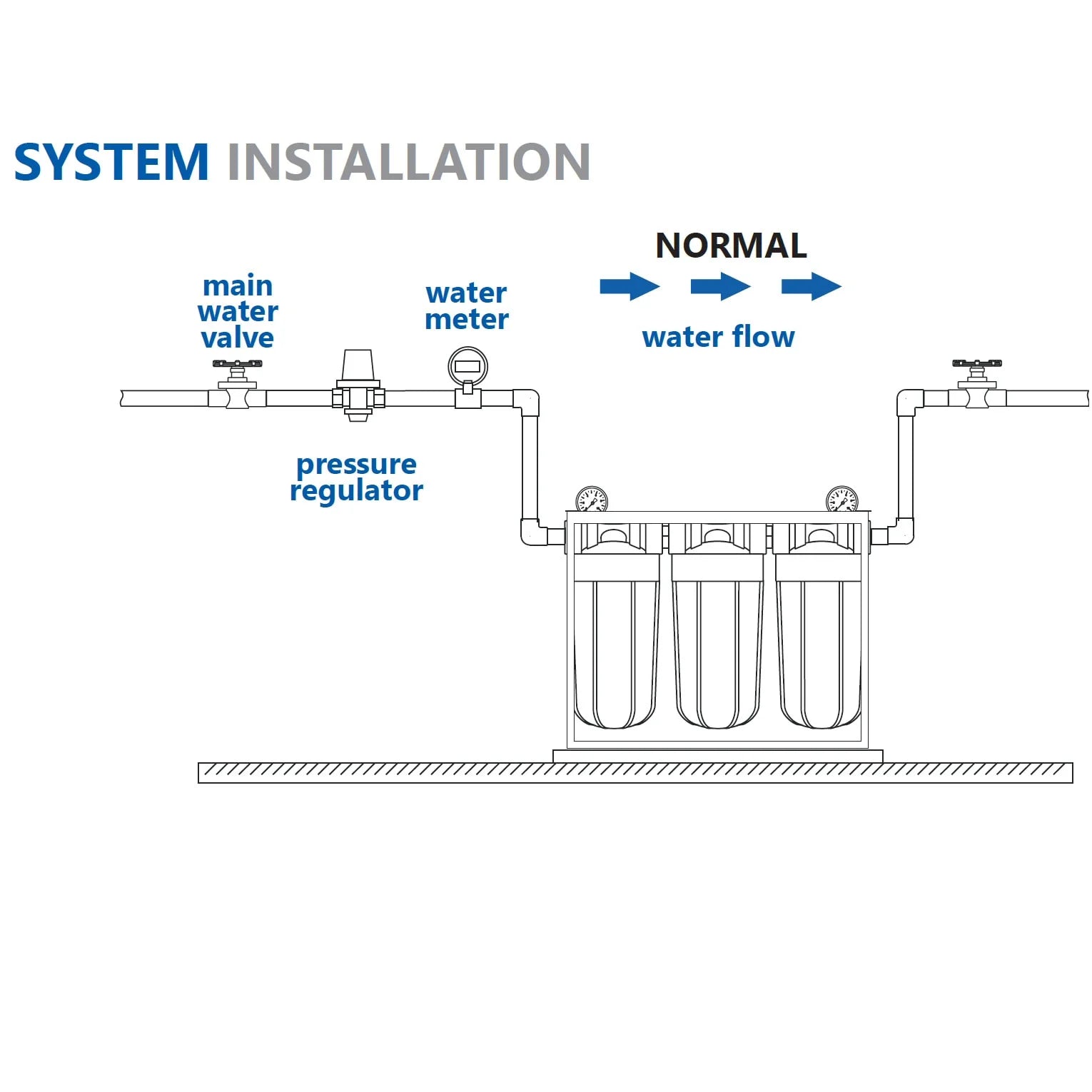 System is equipped with either 10" Big Blue filter housings in blue color, which protect filter cartridges against the phenomenon of algae growth in case the system is installed in a sunny location. The new innovative design of filter housing sumps has a more rounded bottom, which significantly increases resistance to stress (based on burst tests). The housings are equipped with pressure relief valves which allow the release of residual air trapped in the filter after replacing the cartridge. Depending on level of water contamination, system can be configured with sediment and carbon or specialty Big Blue type cartridges.