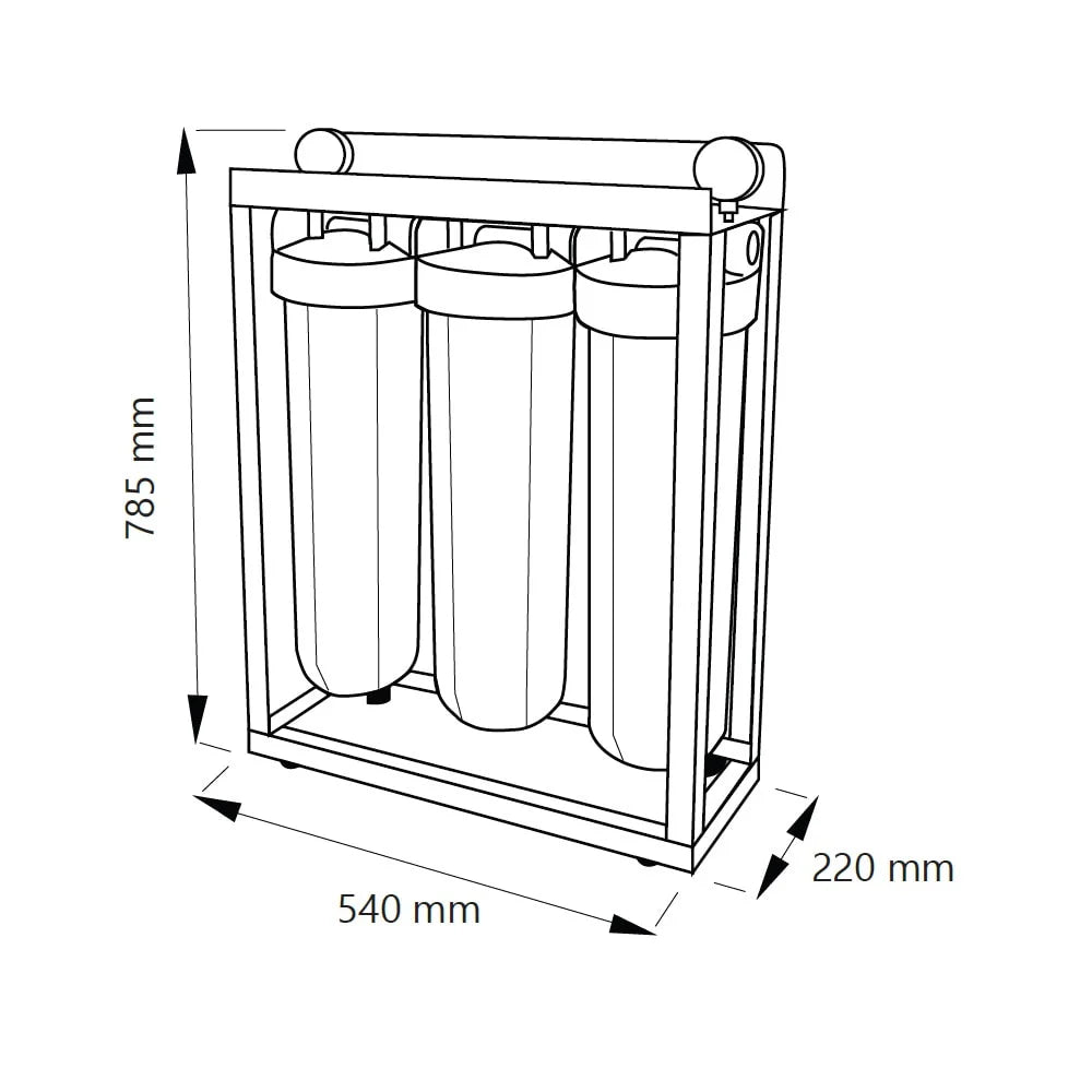 System is equipped with either 20"Big Blue ®filter housings in blue colour, which protect filter cartridges against the phenomenon of algae growth in case the system is installed in a sunny location. The new innovative design of filter housing sumps has a more rounded bottom, which significantly increases resistance to stress (based on burst tests). The housings are equipped with pressure relief valves which allow the release of residual air trapped in the filter after replacing the cartridge. Depending on level of water contamination, system can be configured with sediment and carbon or specialty Big Blue® type cartridge
